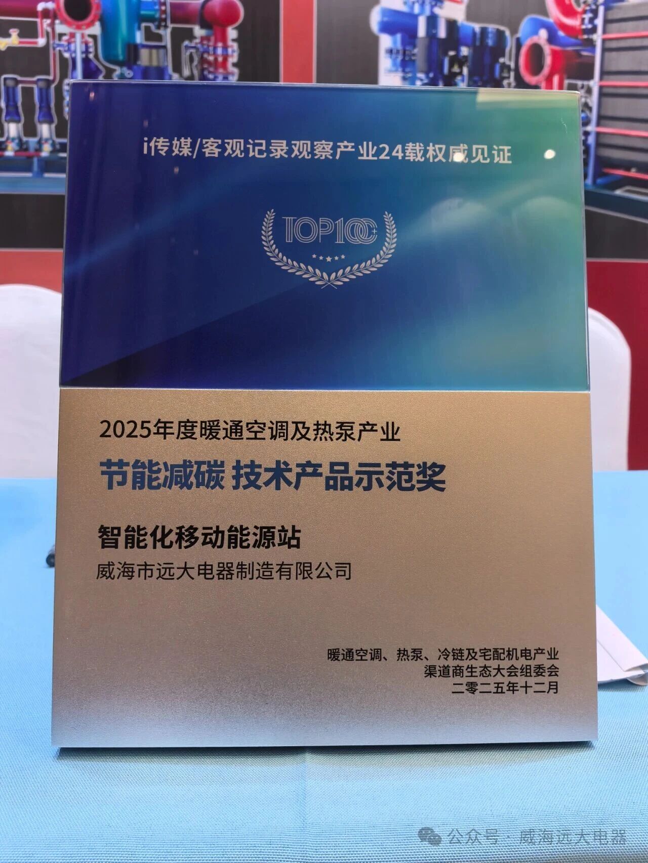 而在這場(chǎng)產(chǎn)業(yè)盛會(huì)上,威海遠(yuǎn)大憑借硬核實(shí)力脫穎而出,一舉斬獲兩項(xiàng)重磅榮譽(yù)——“2025 年度暖通空調(diào)及熱泵產(chǎn)業(yè)助推產(chǎn)業(yè)成長(zhǎng)優(yōu)秀貢獻(xiàn)” 獎(jiǎng)、“2025 年度暖通空調(diào)節(jié)能減碳技術(shù)產(chǎn)品示范獎(jiǎng)”(獲獎(jiǎng)產(chǎn)品:智能化移動(dòng)能源站)